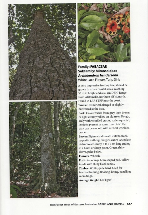 All trees were photographed by the author in rainforests of the Illawarra NSW Yarrawa brush remnants in Robinson NSW, mountain rainforests of Far Northern NSW, rainforests west of and remnant scrubs of the Gold Coast ES QLD, rainforests west of Brisbane SE QLD, dry rainforest scrubs in the districts of Kyogle NSW, Dalby, the slopes of Bunya Mountains, Kingaroy and Kilkivan SE QLD.